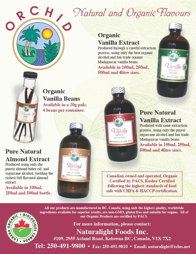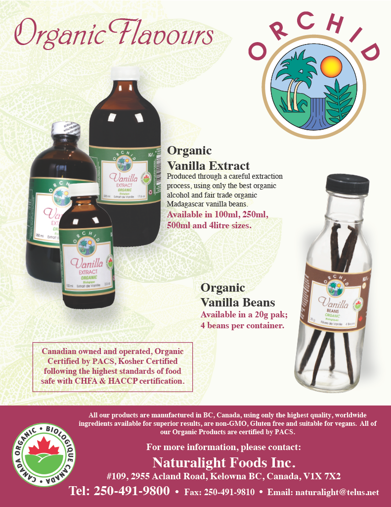 Our ORCHID VANILLA EXTRACT is produced through a careful extraction and ageing process, using only the purest Fair Trade, Organic bourbon vanilla beans from Madagascar. Our ultimate goal at Naturalight Foods Inc, is to provide the world’s best quality vanilla extract in the most environmentally sustainable way. Naturalight has always believed and strongly supports Fair Trade as well as ensuring a strong recycling program. All plastics, glass, cardboard and paper are recycled, with waste only accounting for less than 2% of all materials affiliated with the manufacturing process of our products!